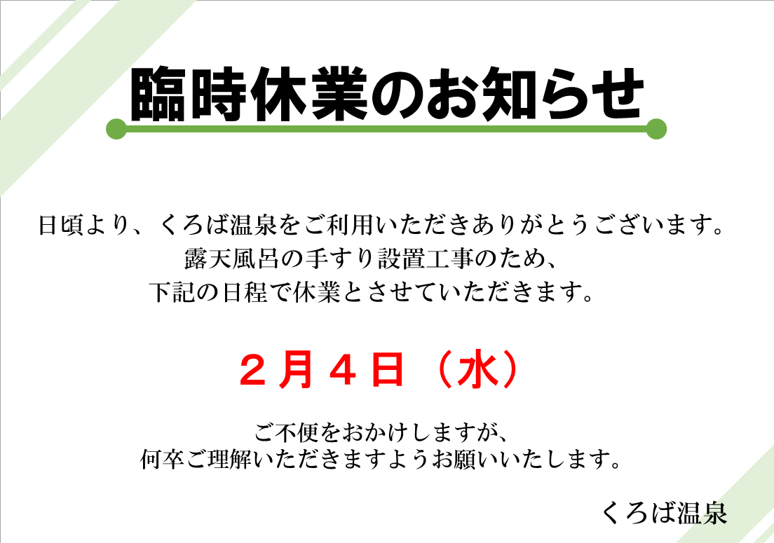 くろば温泉|臨時休館のおしらせ|2月4日(水)