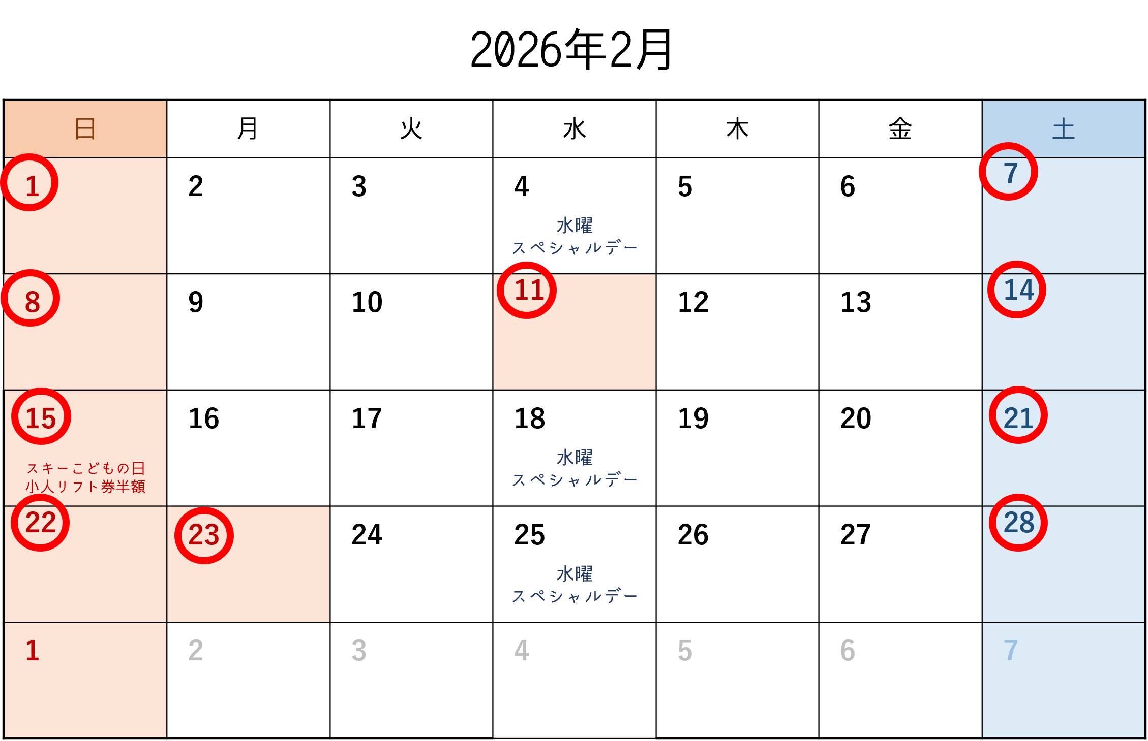 | スペシャルデー | 毎週水曜日 (年末年始・祝日を除く)大人1日券半割 |